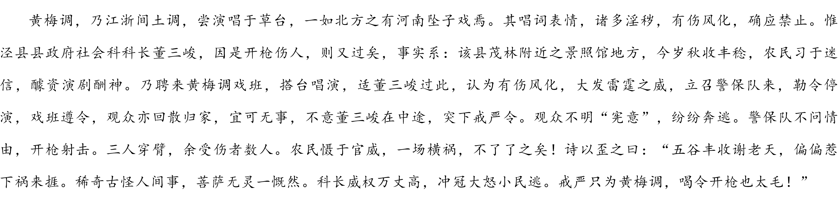 1919年8月11日,《神州日报》发表《花鼓淫戏宜禁》,提到宣城泾县传入黄梅调,全文如下:“泾邑北乡近有一般无赖之徒,勾引花鼓戏子入境演唱黄梅调,借诱赌博。前在孤坑田坊等处演唱,刻在赤滩翠溪桥,唱已多日,不特耗费金钱,甚且败坏风化。当此秋收在即,诚恐乡愚为淫戏所迷,必致废时辍业。有地方之责者,可不急为取缔耶?”这段记载不仅证实了黄梅调在泾县北乡的公开演出,还揭示了其演出场所的流动性(孤坑田坊→赤滩翠溪桥),及其与民俗节庆的结合(秋收在即),更反映出当时官方对黄梅调“伤风败俗”的负面定性。