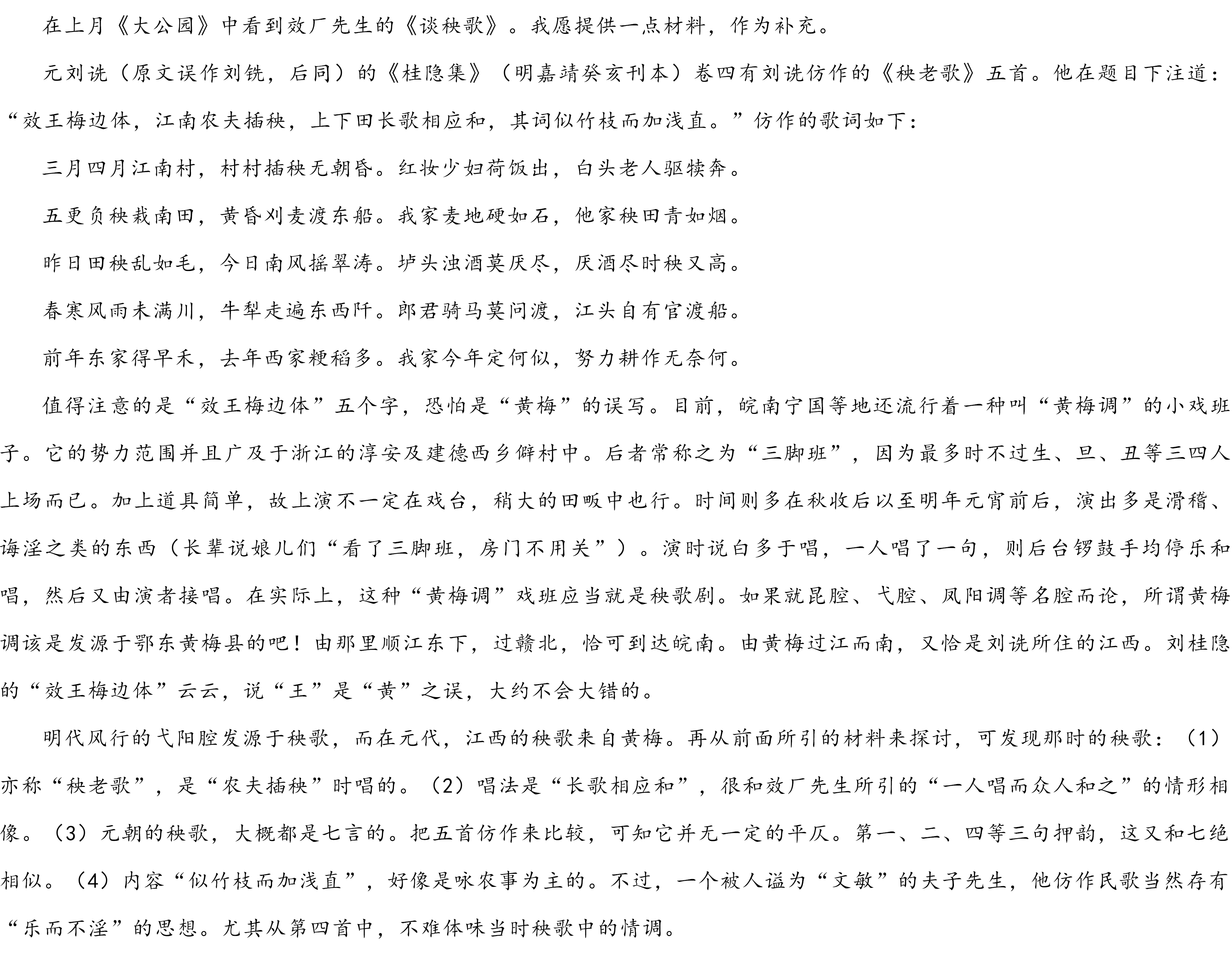 著名黄梅戏历史研究专家陆洪非在《黄梅戏探源》中说:“解放前的书刊中直接提到戏剧形式的‘黄梅调’的地方,我只见到两处。”一是程演生的《皖优谱》,二是《大公报》上的《秧歌的传播》。可见,《秧歌的传播》之罕见,特录全文如下,供读者参考: