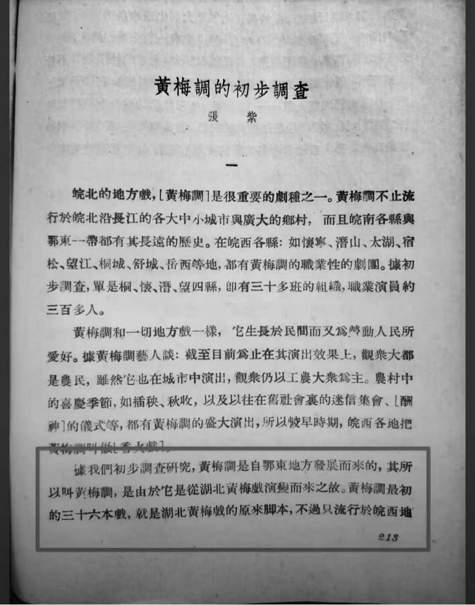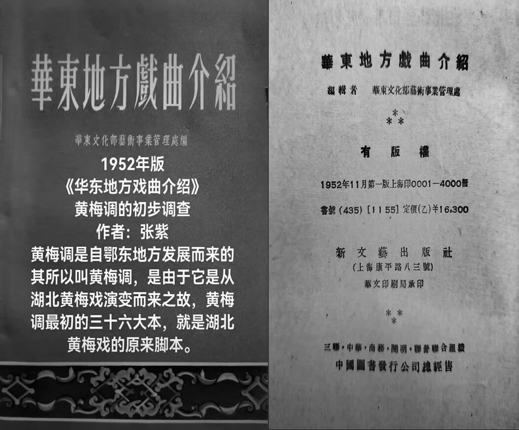 1952年11月出版的《华东地方戏曲介绍》,其中张紫的文章介绍了针对黄梅调的初步调查:黄梅调自鄂东地方发展而来,之所以叫黄梅调是由湖北黄梅戏演变而来,黄梅调最初36本戏就是湖北黄梅戏的原来脚本。