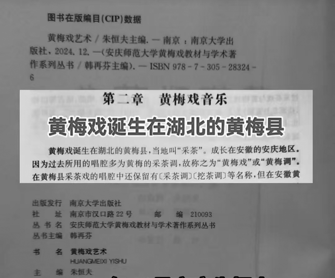 2024年12月出版的安庆师范大学教材中写道:“黄梅戏诞生在湖北黄梅县,当地叫‘采茶’。”