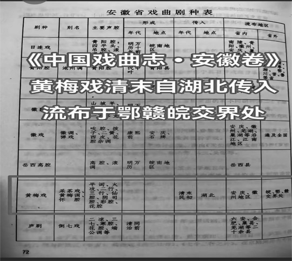 《中国戏曲志·安徽卷》中提到:黄梅戏清末民初自湖北传入流布于赣鄂皖交界处。