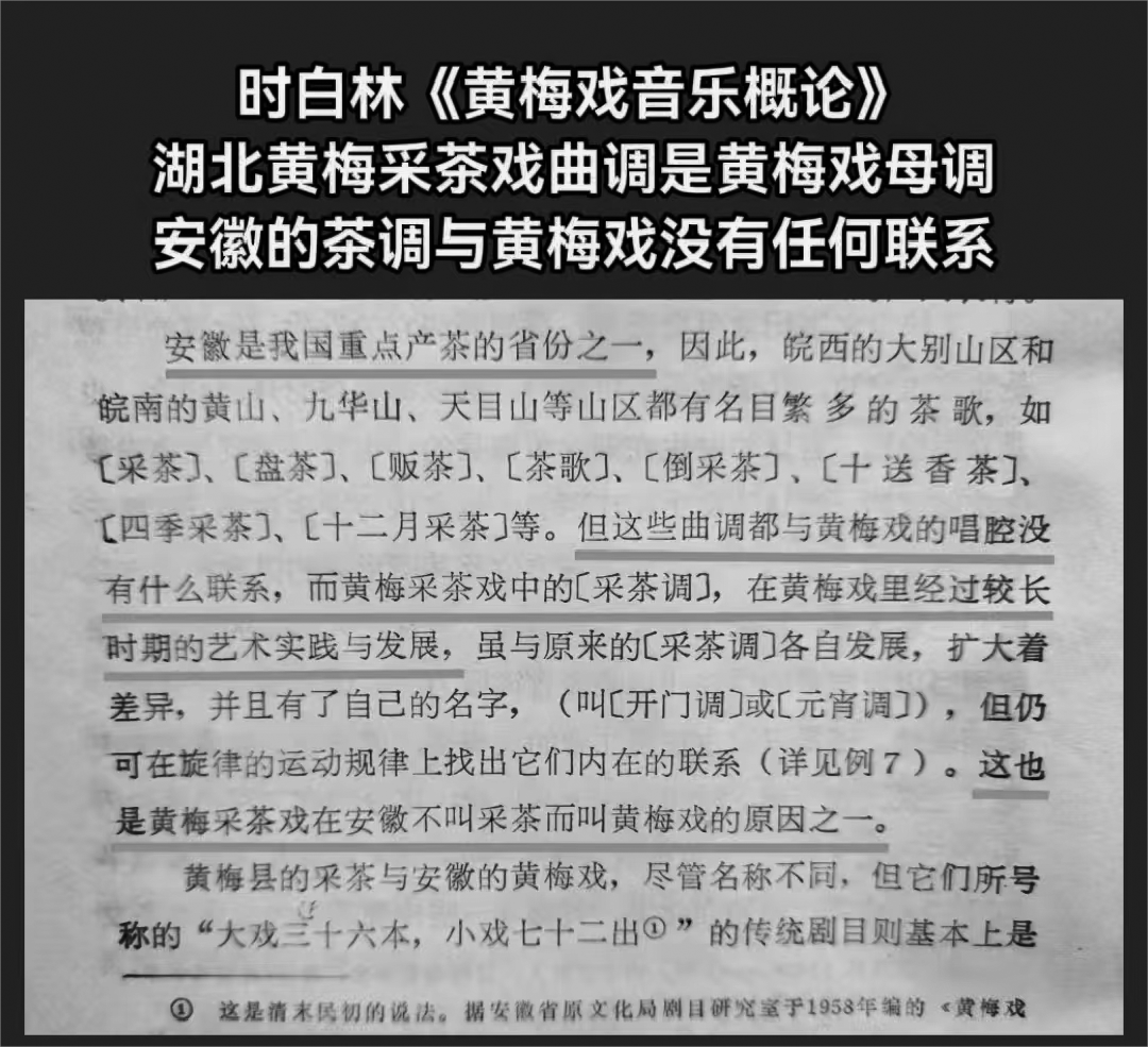 著名黄梅戏音乐家、作曲家时白林先生专著《黄梅戏音乐概论》中写道:“安徽是我国重点产茶的省份之一,皖南的黄山、九华山、天目山都有名目繁多的茶歌,如〔采茶〕〔盘茶〕〔贩茶〕〔倒采茶〕〔十送香茶〕〔四季采茶〕……但这些曲调都与黄梅戏的唱腔没有什么联系,而黄梅戏中的〔采茶调〕,在黄梅戏里经过较长时期的艺术实践与发展,虽与原来的〔黄梅调〕各自发展,扩大着差异,并且有了自己的名字,(叫〔开门调〕或〔元宵调〕),但仍然可在旋律的运动规律上找出它们内在的联系,这也是黄梅采茶戏在安徽不叫采茶而叫黄梅戏的原因之一。”