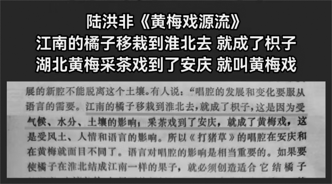 著名黄梅戏剧作家陆洪非(1923—2007)在论著《黄梅戏源流》中写道:“江南的橘子移栽到淮北去,就成了枳子,这是因为受气候、水分、土壤的影响;采茶戏到了安庆,就成了黄梅戏,这是受风土、人情和语言的影响。”